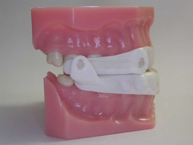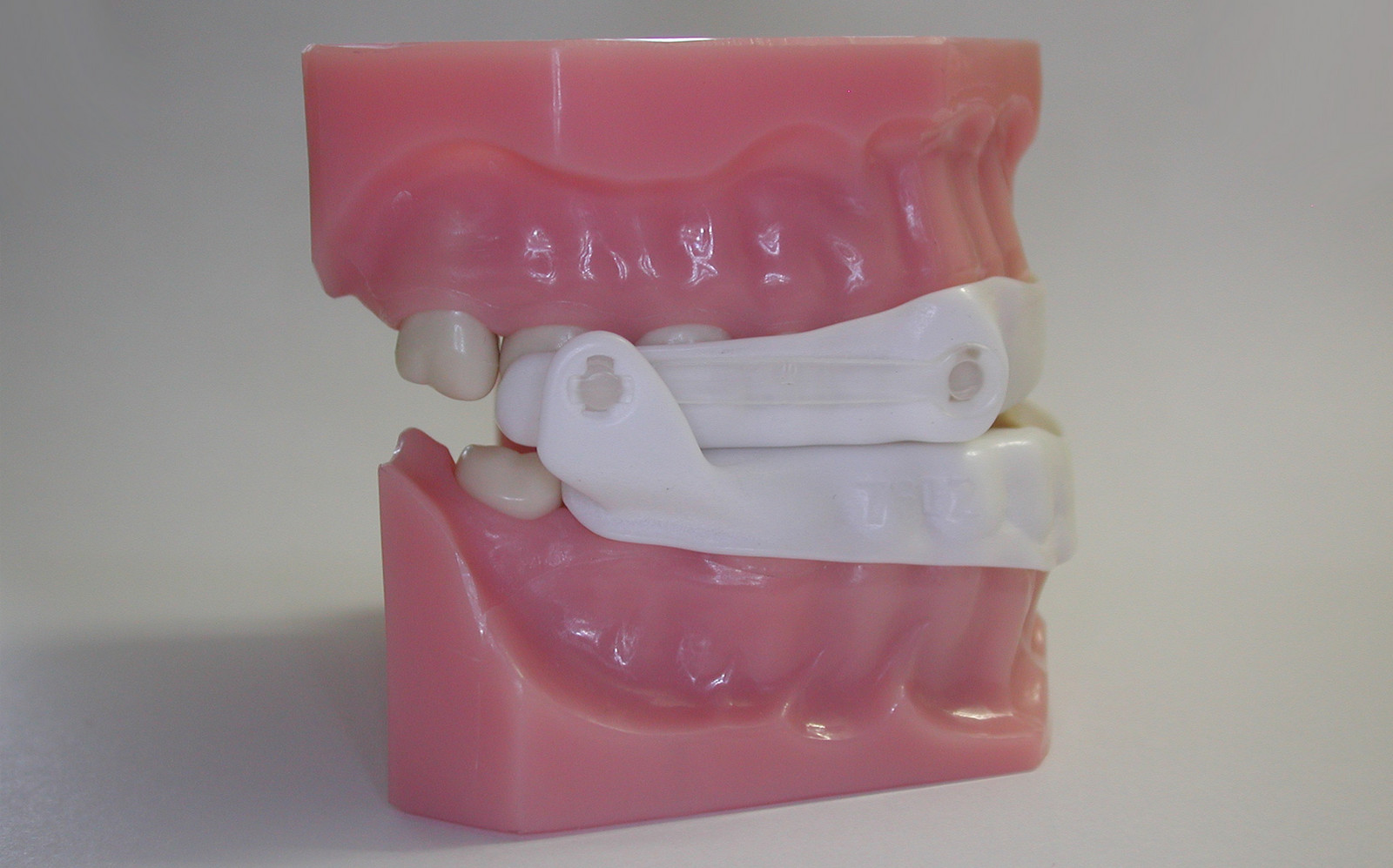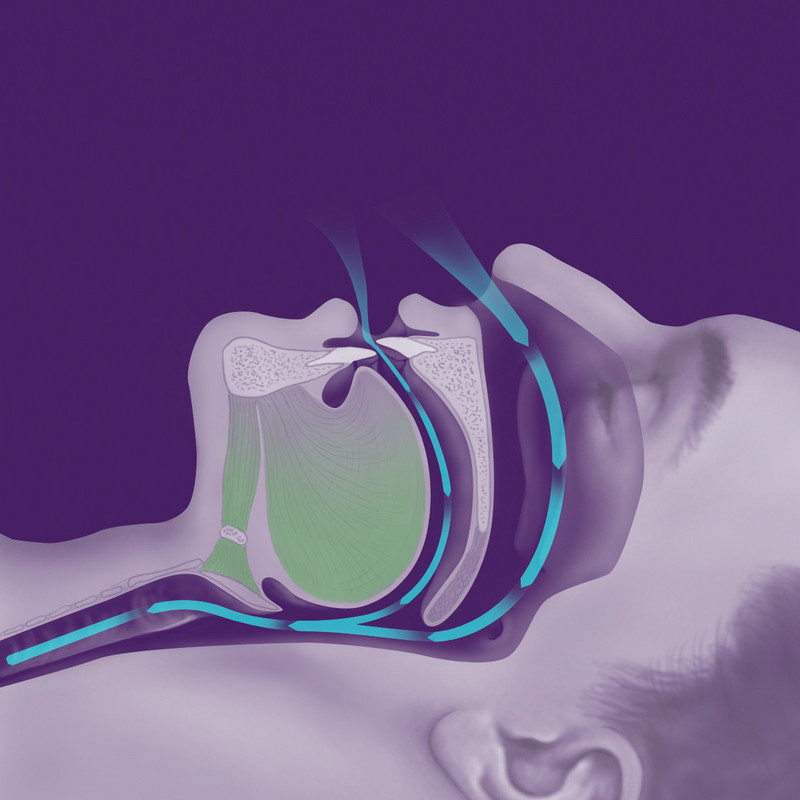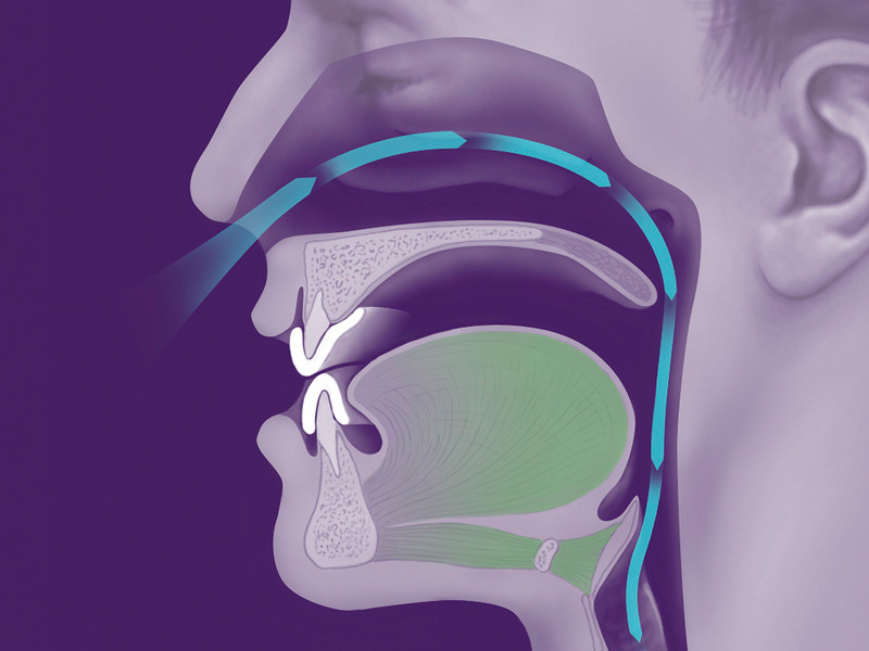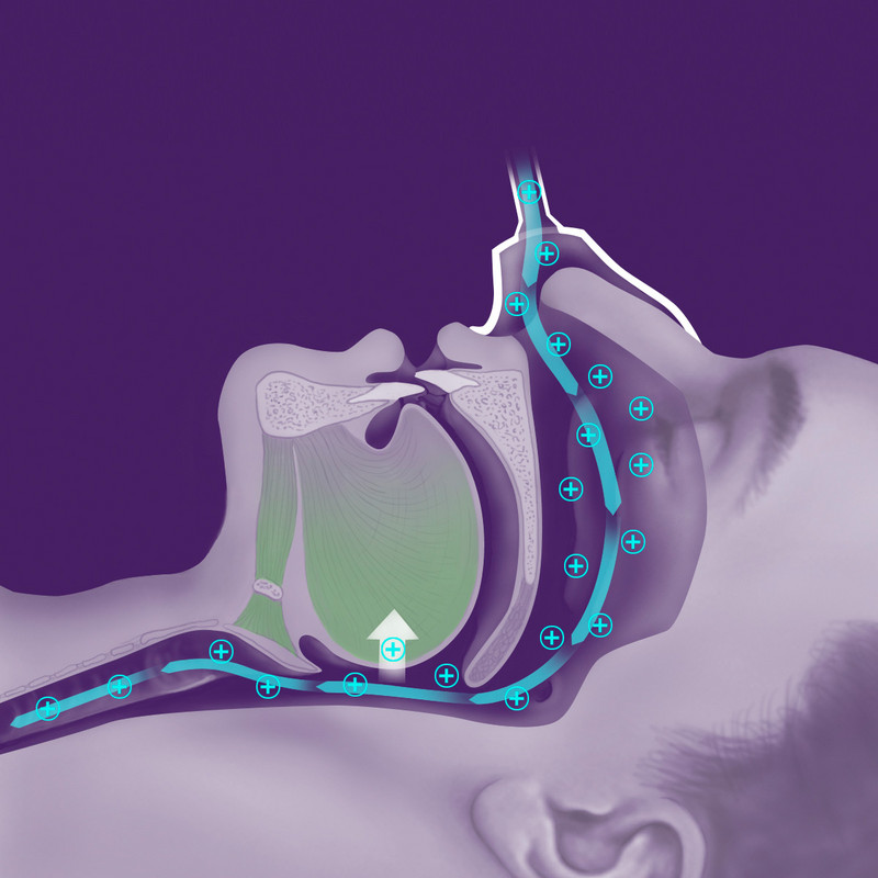 Das grazile Gerät wirkt gegen Atempausen und Schnarchen, indem es den Unterkiefer bzw. die Zunge nach vorn verlagert. So wird verhindert, dass die Zunge im Schlaf nach hinten sinkt und die erschlaffte Rachenmuskulatur kollabiert. Die Atemwege bleiben frei, das Schnarchgeräusch wird deutlich reduziert bzw. ganz beseitigt.